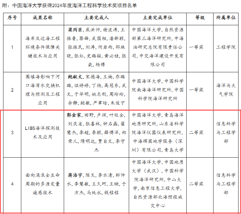 近日,中国海洋工程咨询协会2024年度海洋工程科学技术奖颁奖大会在广西北海召开。中国海洋大学作为第一完成单位,获颁海洋工程科学技术奖5项,其中一等奖2项、二等奖3项,获奖数位居全国各获奖单位之首,创历史新高。其中,信息科学与工程学部郭金家教授级高工主持完成的成果“LIBS 海洋探测技术及应用”、信息科学与工程学部陈戈教授团队的成果“面向涌浪全生命周期的多源定量遥感技术”荣获二等奖。
