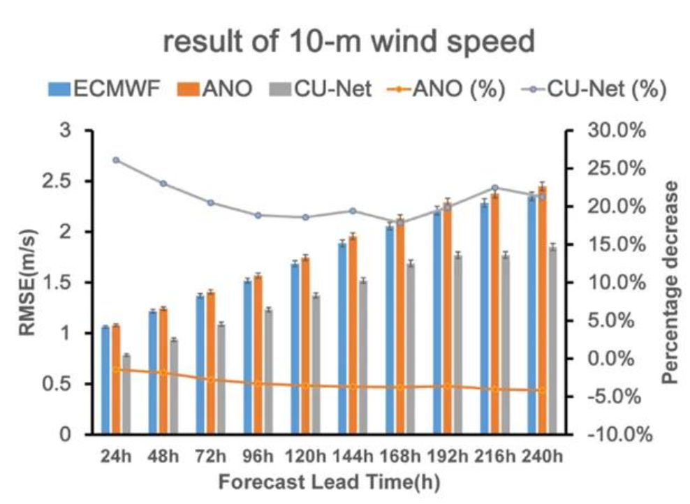 The team proposed a nested encoder-decoder network method to achieve intelligent deviation correction for numerical weather forecasts. The test results showed that this method achieved the highest improvement in forecast performance of more than 25% compared to ECMWF, which is commonly used in the industry, for difficult issues such as correcting 10-meter wind speed and wind direction. This research achievement was published in Advances in Atmospheric Sciences (AAS) as a cover paper and has been tracked by internationally renowned science and technology news platforms such as EurekAlert! (International media such as New York Times, CNN, BBC, etc. obtain scientific and technological news from this platform). This achievement has been applied to the key research and development program "Key Technologies for Prediction and Guarantee of the Beijing Winter Olympics" and its operational application has been launched in the Beijing Urban Meteorological Research Institute, and will be applied to the meteorological guarantee service for the 2022 Beijing Winter Olympics.