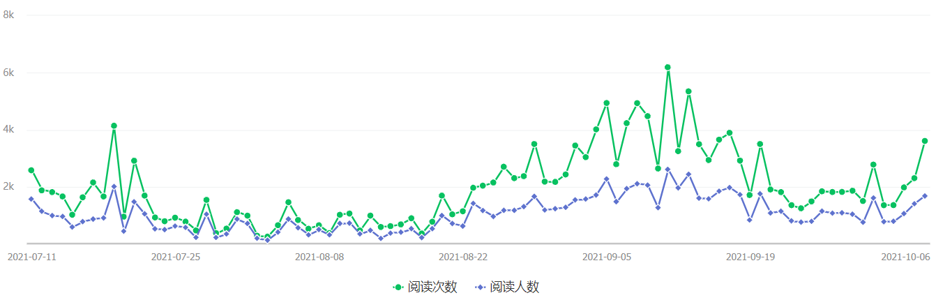 根据本时期每日阅读次数与阅读人数做表如上,可见日阅读次数以4K以下居多,日阅读人数以2K以下居多,流量高峰时期集中在“军训”,“迎新”等大型活动期间。由此,日后应当提高日常原创文章水平,在非大型活动时期吸引更多关注与流量。
