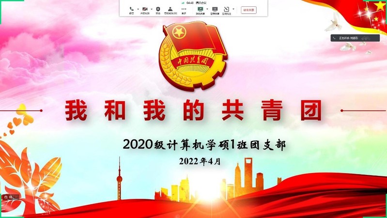 4月19日,2020级计算机学硕1班团支部开展了“我和我的共青团”主题团日活动。活动中,团支书刘涵青带领支部成员齐唱共青团团歌,随后为大家播放了中国共产主义青年团发展历程的相关视频资料并组织大家分享共青团发展史中的故事,让大家走进历史,学习革命先辈们的光辉事迹与伟大精神,激发同学们的爱国热情。最后,团支书呼吁大家要矢志践行“请党放心,强国有我”的青春誓言,在实现中华民族伟大复兴中国梦的征程中贡献磅礴青春力量!