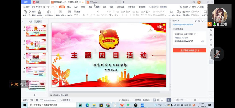 建团百年之际,2021级电子信息类四班团支部于4月开展了“我和我的共青团”主题团日活动。团支部深入学习共青团历史发展的四个时期,了解百年来共青团为争取国家独立和民族解放以及在当今时代为实现中华民族伟大复兴所做出的巨大贡献。接着,尤红等团员分享了自己对中国共青团发展历史的认识与理解。最后,团支书武文宁带领大家回顾了上一学期团支部的建设和发展成果及未来的规划,支部成员在互动中意识到了自己与团支部的紧密联系,加强了心中对于团支部的认同感及归属感。
