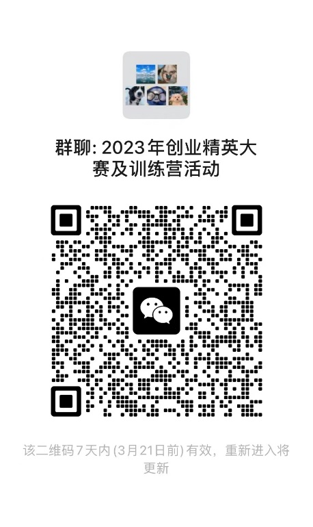 参赛项目团队原则上均需参加训练营和创业指导系列活动,参与情况将作为评奖依据之一;拟报名参赛的项目团队和对活动感兴趣的同学可以加入微信群,每次活动安排和具体通知均会在群内和学生就业创业指导与服务中心网站发布,微信群二维码: