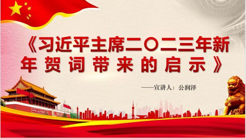 首先,公润泽向大家做了关于《习近平主席二〇二三年新年贺词启示》的学习总结,习近平主席在新年贺词中深情回顾党和人民走过的极不平凡征程,鲜明宣示把新时代中国特色主义事业不断推向前进的坚定决心和必胜信心,号召全党全国各族人民团结奋斗,共创美好未来。