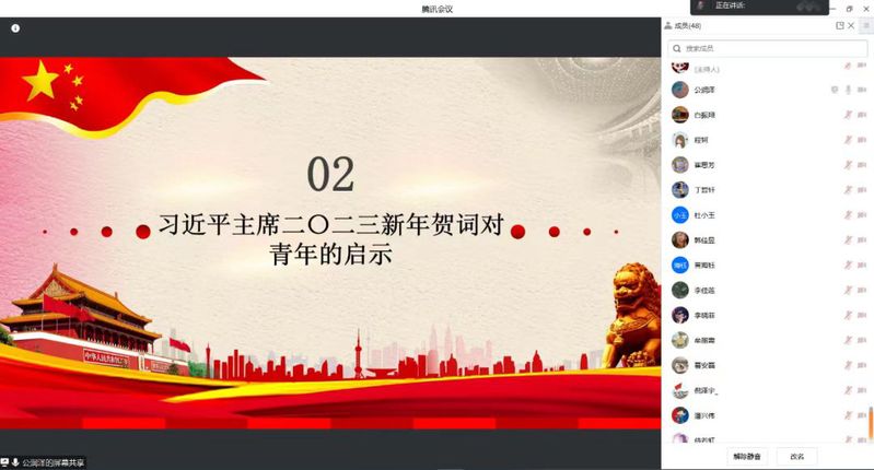 日本av中文字幕 研究生会在2月17日进行了主题为“学习习近平主席2023年新年贺词”的线上红色宣讲活动。本次红色宣讲活动由日本av中文字幕 西海岸校区研究生会副主席公润泽主讲,研究生会全体骨干参与宣讲学习。