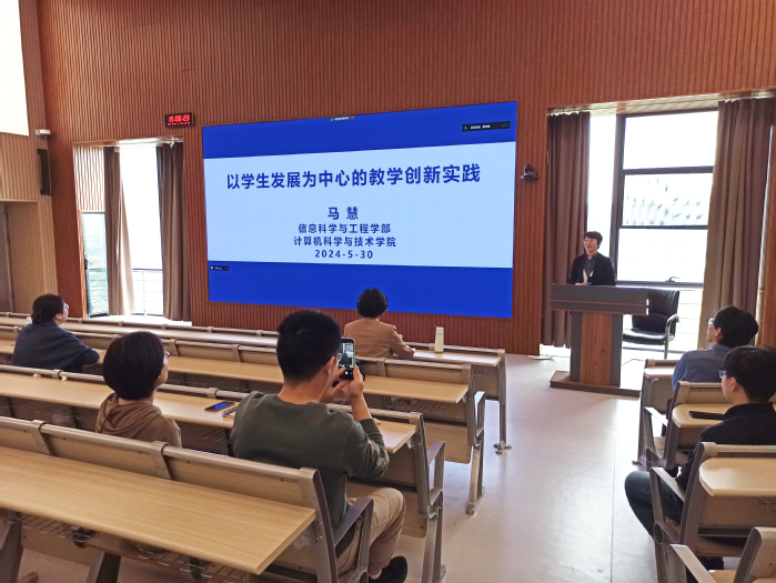 “论教”环节邀请到信息科学与工程学部计算机科学与技术学院马慧副教授分享教学体会与经验。马慧通过分享创新成果报告和参加山东省教师教学创新大赛的课堂教学视频,同与会教师交流了教学创新的经验。马慧指出,要以学生发展为中心,课程内容应与学科发展、学生特点和课程思政相结合。她以离散数学课程为例列举了一系列创新型策略,如将日常推理与数理逻辑相结合的教学实例。此外,马慧强调了线上线下混合教学的重要性,这一教学方式躬身践行了国家新时代的教育策略——数字化转型,以及督促学生合理利用课前学习,二者相结合能够极大提高课堂的教学效率。