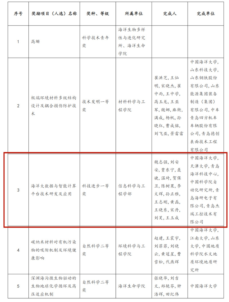 中国海洋大学主持获得2023年度山东省科学技术奖励清单