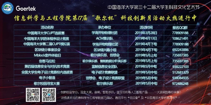 为进一步促进青年大学生全面发展、提高学生综合素质、丰富校园文化,充分发挥校园科技创新活动的育人作用,全面展现海大学子的良好精神风貌,营造和谐健康、高雅文明的校园文化氛围。信息科学与工程学院结合学院学科特点,经研究决定举办信息科学与工程学院第十七届“歌尔杯”科技创新活动月。有关事宜通知如下: