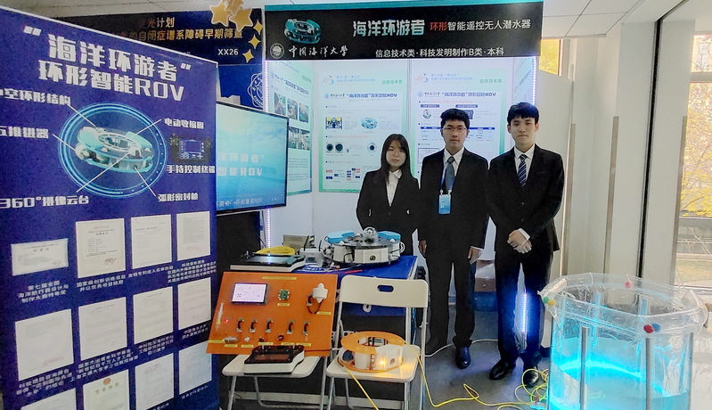 《“海洋环游者”环形智能ROV》由信息科学与工程学院杨华、赵凤娇指导,2016级光电信息科学与工程专业本科生谢诚、2017级计算机科学与技术专业本科生崔丽莹、2017级海洋技术专业本科生朱云溪、2019届通信工程专业本科毕业生秦天一以及来自工程学院和管理学院的8名同学共同完成。该作品采用独创的水下总线系统实现了模块化搭建,中空环形和弧形密封舱结构设计,实现了通过无机械臂的电动可控收缩环进行抓取。项目使用五推进器提供各向推力,配合混控系统可实现复杂航行动作,高度集成化的地面控制终端降低了操作入门难度,独创的结合VR的头部追踪360°全景云台,配合多种传感器及灯控系统,使零基础使用者可轻松实现多种功能控制,可广泛应用在科学研究、教育教学、水下娱乐等领域。