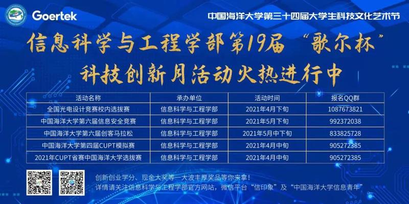 本届科技创新活动月由共青团中国海洋大学委员会主办,信息科学与工程学部团委承办,得到了歌尔股份有限公司的大力支持。根据学院情况,确定了以下几项活动,活动涵盖科技竞赛、学术创新、科技分享等多个方面。